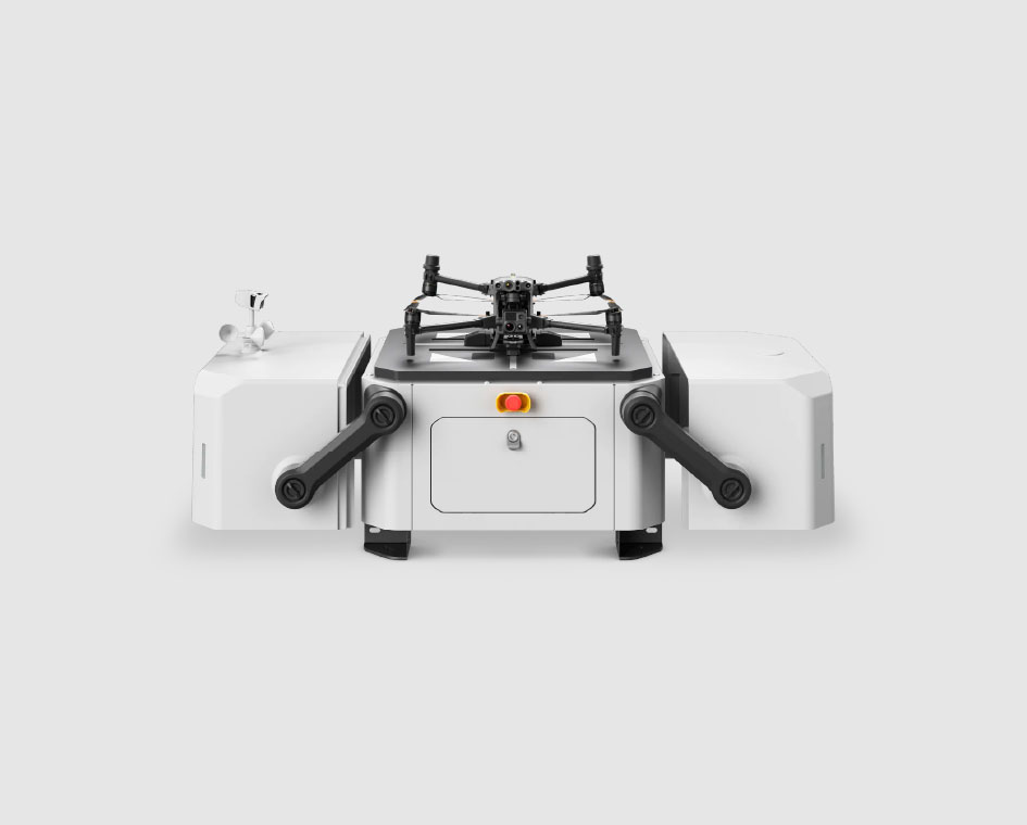 A estrutura do DJI Dock foi criada para comportar drones DJI Matrice 30, suportando pouso, recarregamento e decolagem e executando missões programadas através do DJI FlightHub 2.